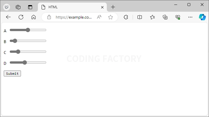 Submit을 클릭하면 URL에서 값을 확인할 수 있습니다. 아래 상태 그대로 전송하면 URL 뒤에 ?a=50&b=100&c=60&d=400가 붙습니다.